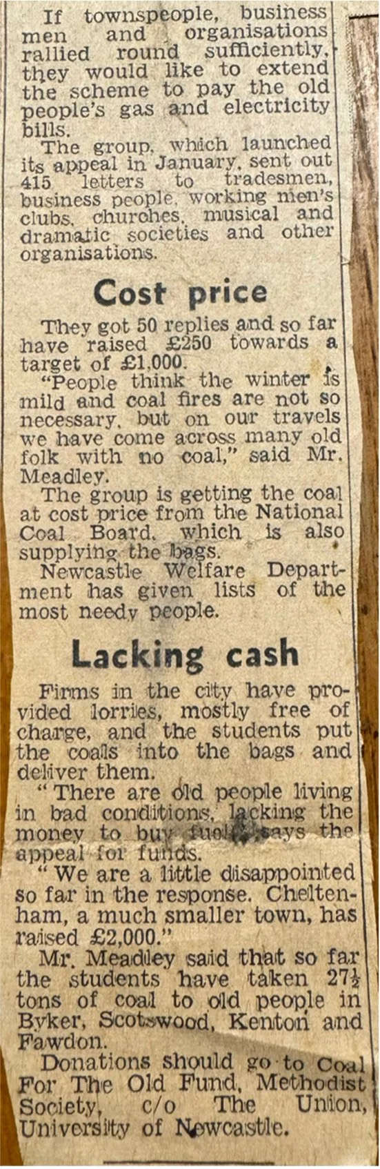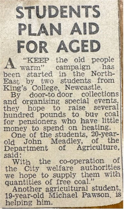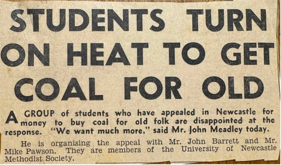 Within Newcastle there were real pockets of poverty, particularly amongst the elderly, and I learnt that there many who could not afford coal to keep themselves warm during the freezing winters that we experienced in the northeast. So it was that three of us - John Barrett, Mike Pawson and I – all in our second year - decided to do something about it in the name of MethSoc. We called the scheme COAL FOR THE OLD – which would probably be deemed as WOKE today but back then it was simply a label that said what was in the tin!