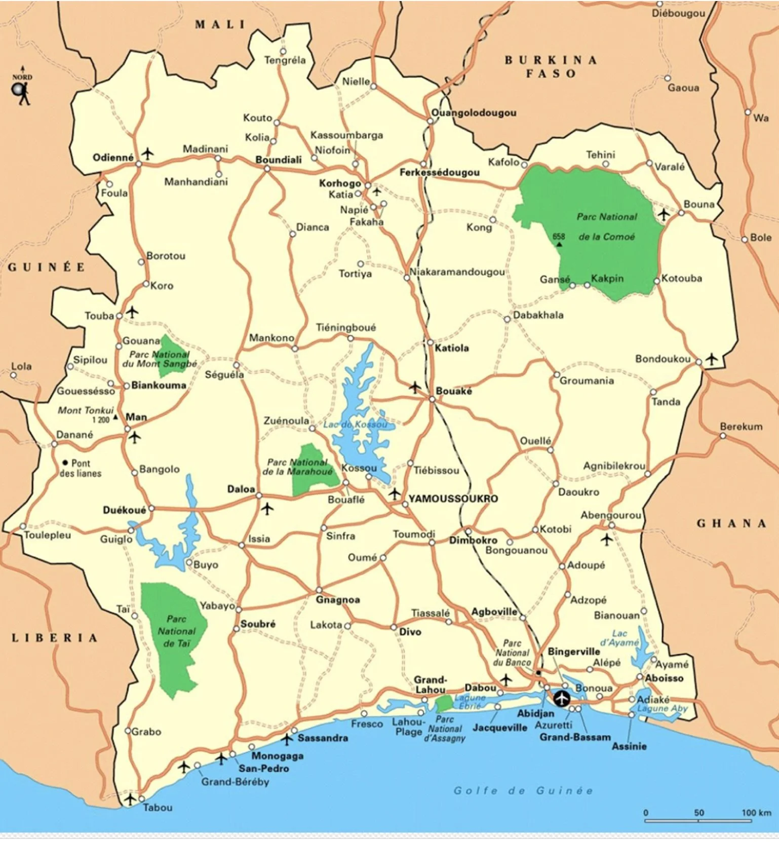 Côte d’Ivoire, also known as the Ivory Coast, is another of those creations from the scramble for Africa that took place between 1840 to 1914, by which time 90% of Africa was under European control. It borders Guinea to the northwest, Liberia to the west, Mali to the northwest, Burkina Faso to the northeast, Ghana to the east and the Gulf of Guinea to the south.